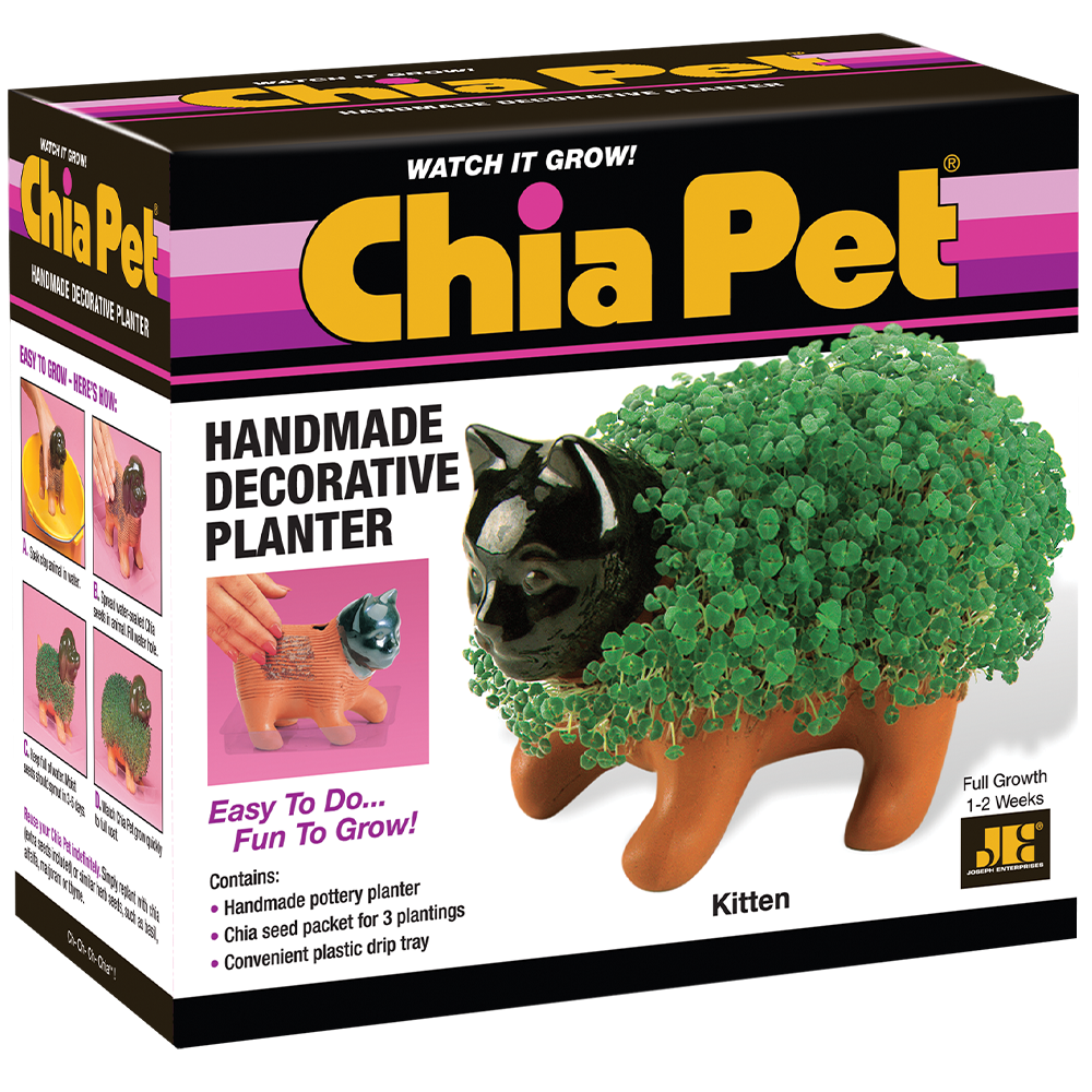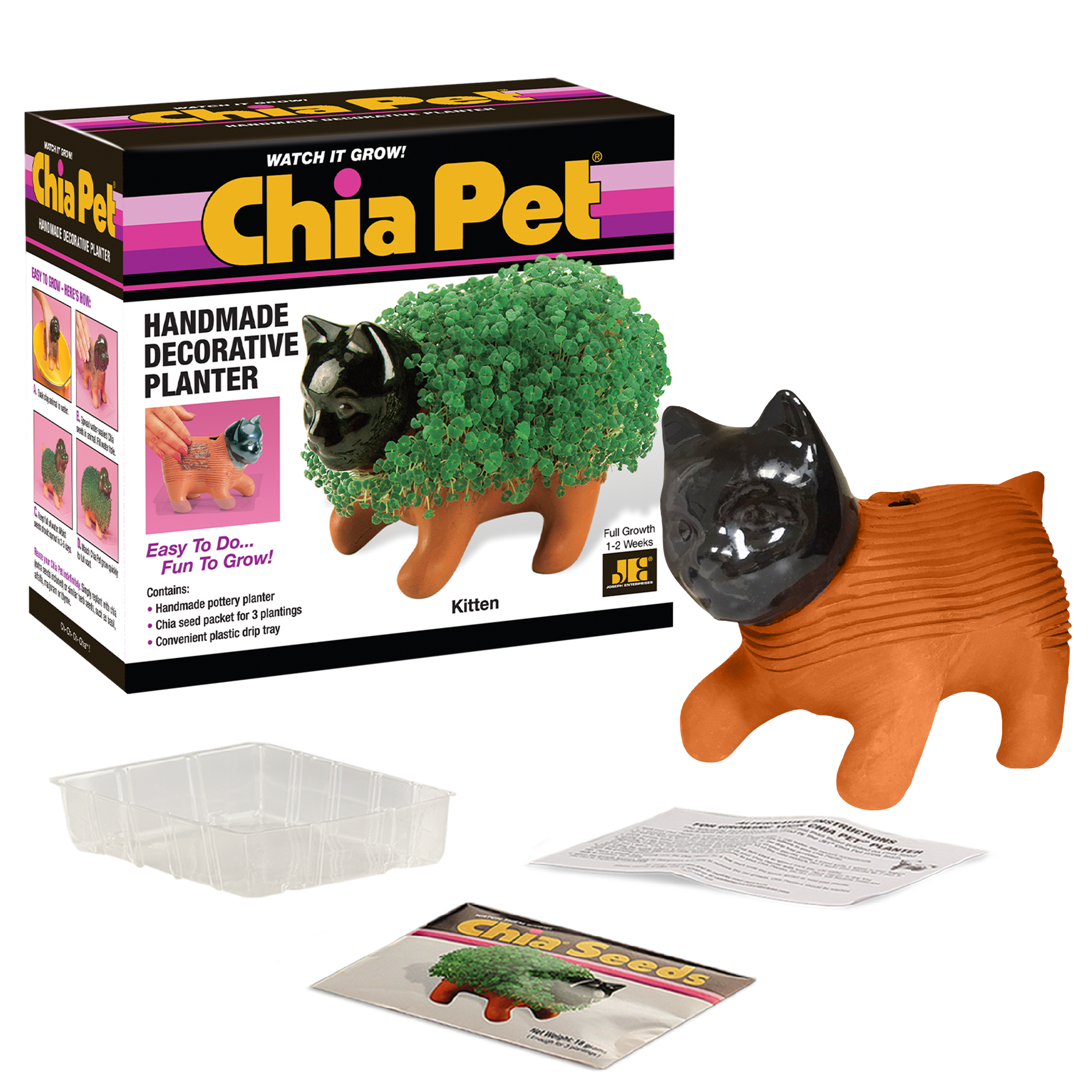A-meow-zing! The Original Kitten Chia Pet is a vintage icon ready to be your new feline friend! Great for both kids and adults, Chia Pets make for a fun and interactive activity as you plant your chia seeds and see them sprout within days. Shaped like a cute kitty, this terra cotta chia planter has paws, tail, and a glazed head. Watch your cat grow a full coat of luscious, green chia sprouts in just 1-2 weeks! Display your Chia Pet on your desk, windowsill, or anywhere else you want to add a touch of greenery and nostalgia. It’s the purr-fect gift for any cat lover!