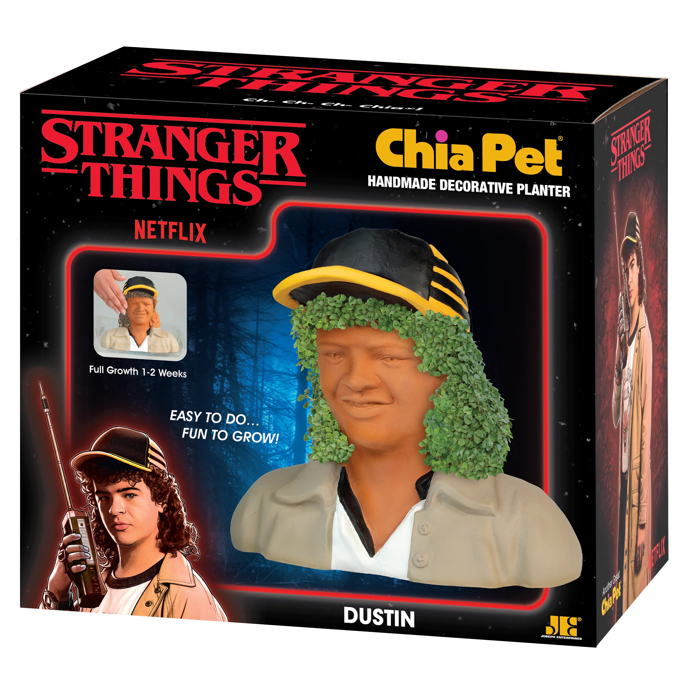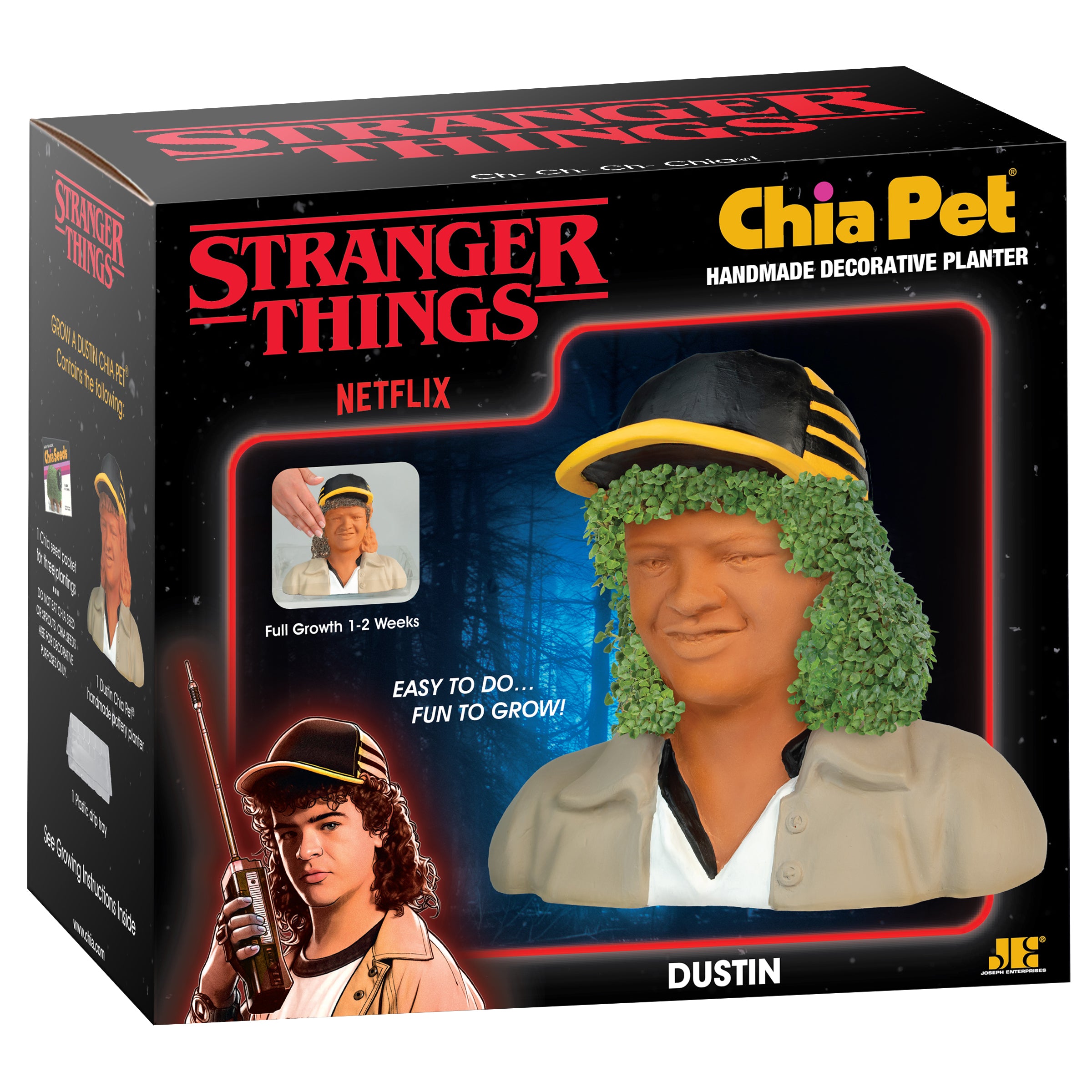 Dustin from the hit Netflix series Stranger Things is a Chia Pet! He may have escaped the Upside Down, but he can’t escape the fun of Chia! Just spread the seeds, water, and watch it grow!